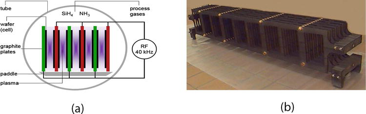Малюнок 14. (а) Принципова схема періодичного процесу PECVD для осадження SiNx: H та (b) графітовий човен для завантаження пластин Si у печі PECVD.