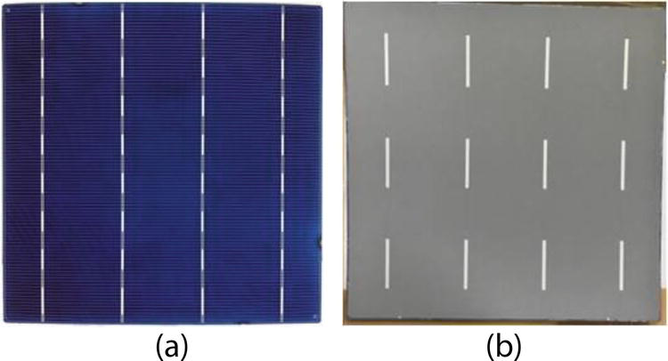 Лицьова металізація на основі Ni-Cu вимагає додаткового кроку візерунка ARC на лицьовій стороні, на відміну від металізації на основі пасти Ag, а в більшості випадків також додаткового етапу спікання Ni для зменшення контактного опору та хорошої адгезії металевого штабеля [42 ]. Комерційні сонячні елементи mc-Si, розрізані DWS, на основі покритого стеком Ni-Cu-Ag, продемонстрували з шириною пальця 22 мкм, співвідношенням сторін близько 0,5 та такою ж ефективністю, як і у еталонних екранованих друкованих сонячних елементів на основі Ag [45]. ].